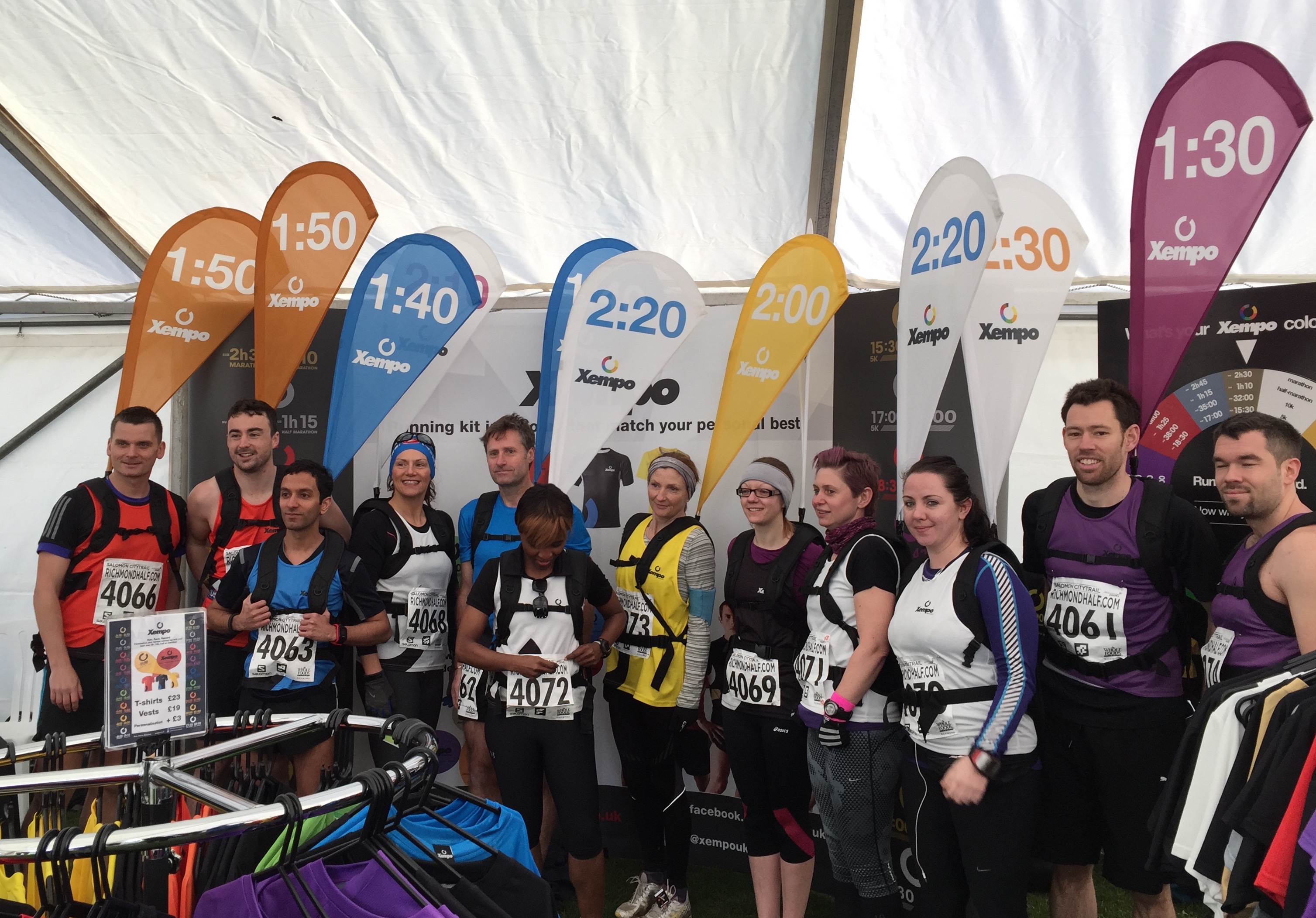 In typical fashion, Sunday morning trains were a little slow. Despite taking the first train in, my journey to the lovely Richmond Park still took over 90 minutes. I hurried and made my way to the Xempo tent, where other pacers were already getting set-up. My race pack was waiting for me there, as well as a light-weight running vest/back pack, along with an Xempo branded “1:40” blue flag. Set-up was fairly quick, and within a matter of minutes we were all ready to go!