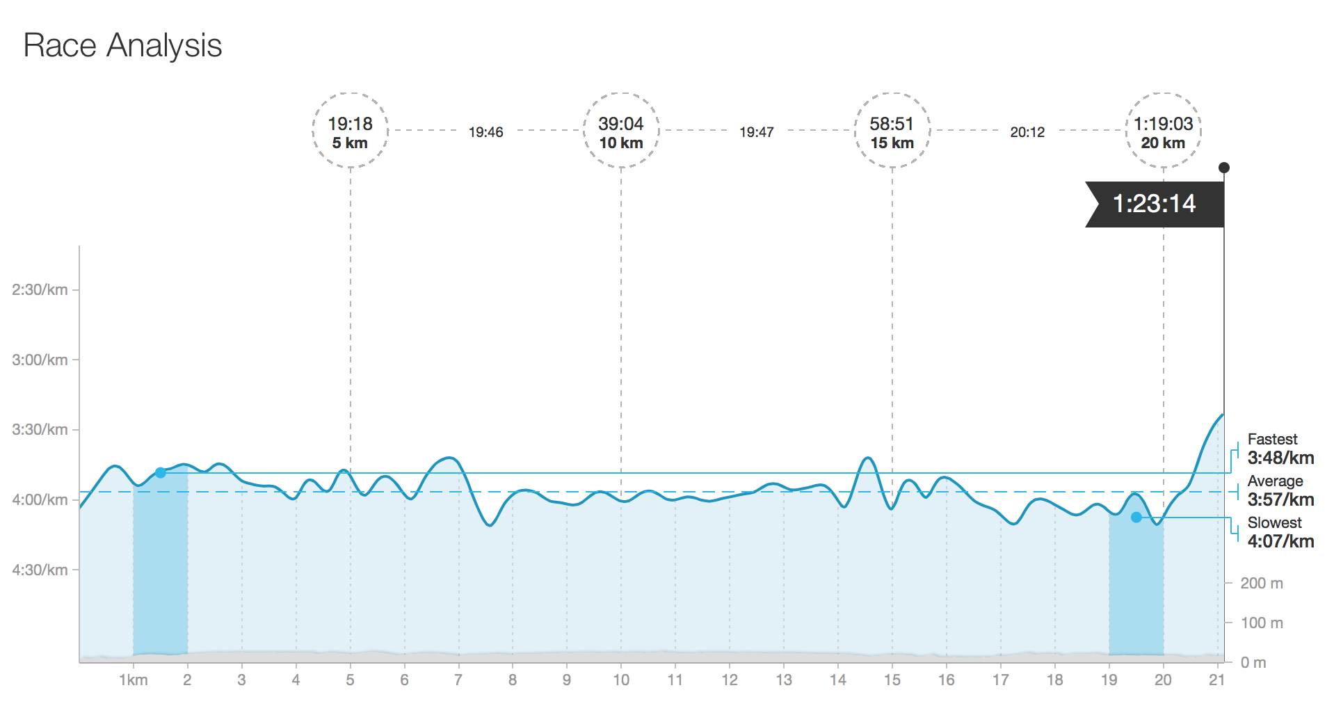 I ran comfortably hard, reaching 10km in 38:29. This was quite interesting, as my current PB for a 10k race is 38:18. This gave me huge confidence that I should be able to run under 38 minutes at the Bupa 10,000 in 2 weeks time. I continued to push through, and felt great until the 17km mark. After this point, I began to feel a little tired, and maintaining my pace took more effort. I knew I was on track for a PB, albeit a minor one, and this desire was enough to keep me going! The crowd support helped with this, who were absolutely fantastic. Race makers at the water aid stations were also supportive, and I really appreciated their efforts today.