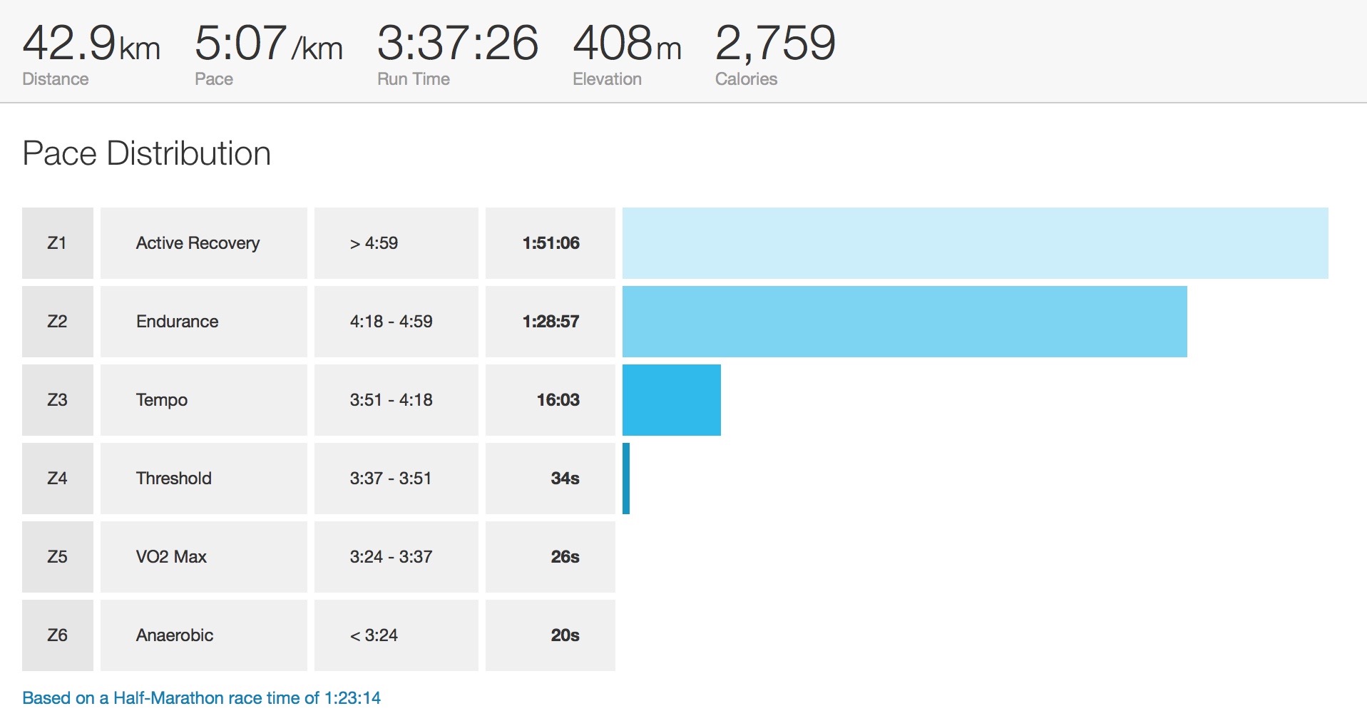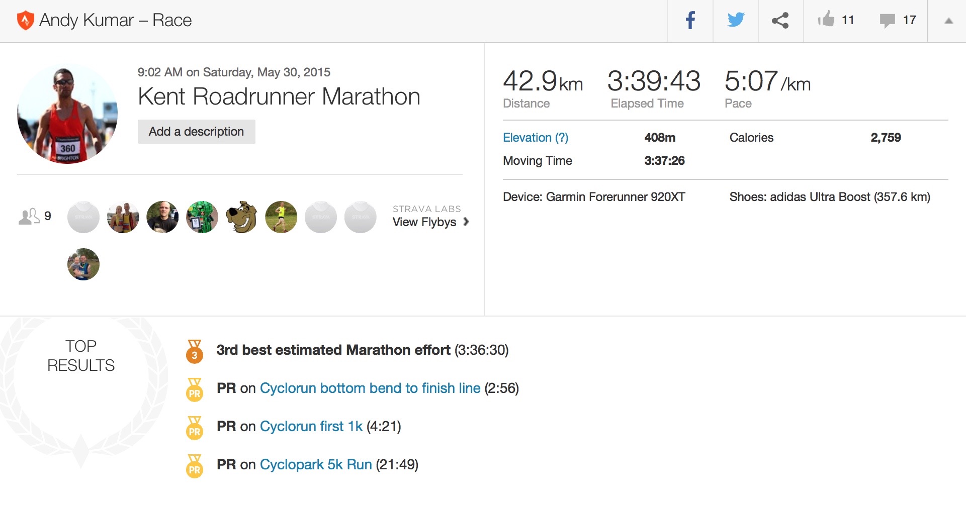 I found the last few laps a little draining, but powered through. I picked up the pace on my final 1km, and finished strong in 3:39:40. No way near a PB, but this was not my aim today. I had an enjoyable training run and just wanted to finish in under 3:45, so was pleased with my performance. I had my timing chip removed before having a huge medal placed around my neck. I also picked up a nice goody bag which was filled with lots of edible snacks, and then had a post race stretch-out and massage. The Cyclopark also has shower facilities, so it was great to be able to freshen up and change into some nice clothes so soon after the run. Interestingly, my Garmin 920XT recorded that I ran 42.9km (race stats below).