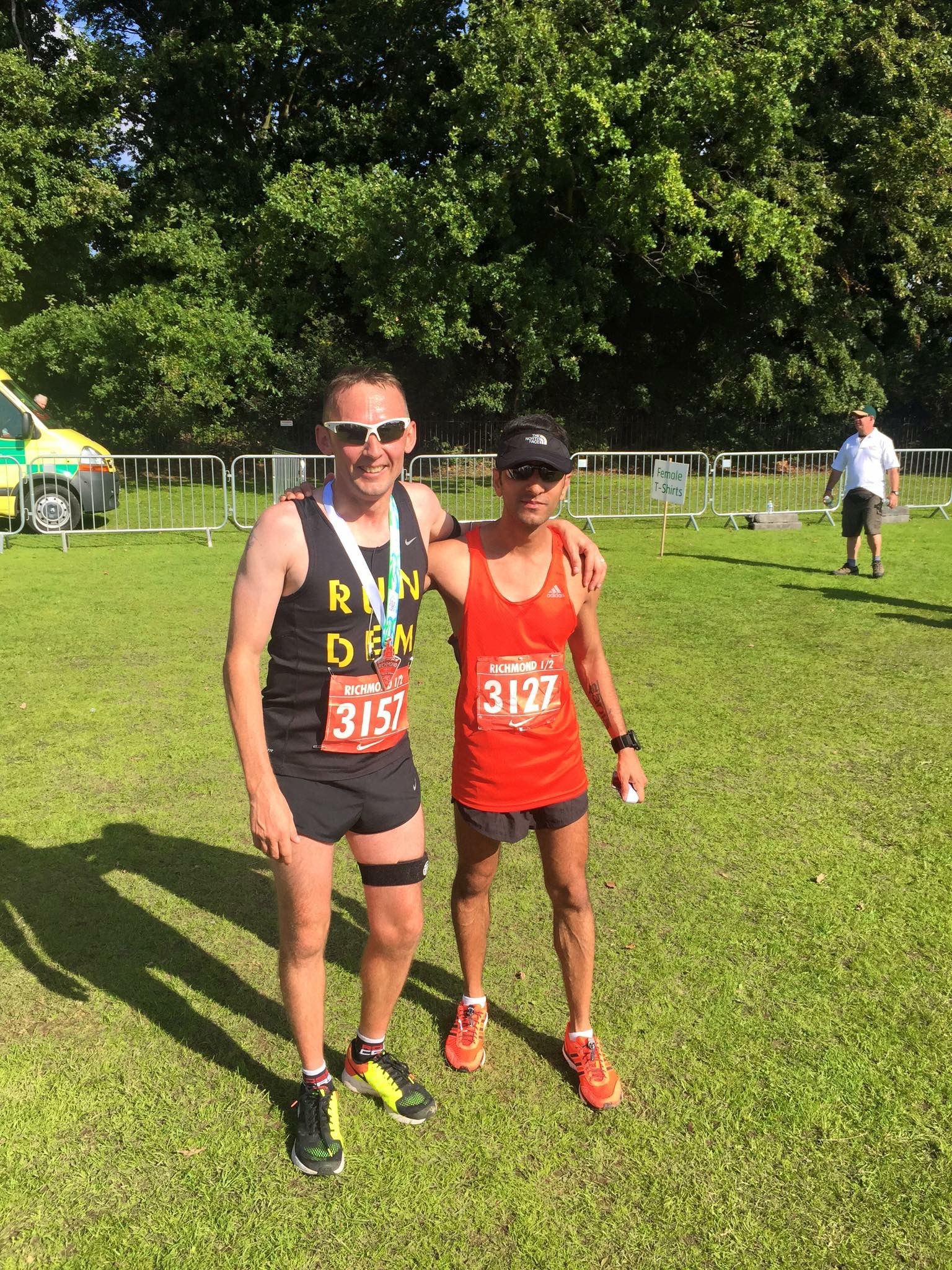 Following the run, I collected my medal (part 2 of the pie!). We also saw Pete Chapman at the finish, who ran the 10k and also had an awesome run with a PB in 45 minutes. He kindly took a snap of us fresh after the race. Great to also see that Dan smashed his target by finishing in 1:33!