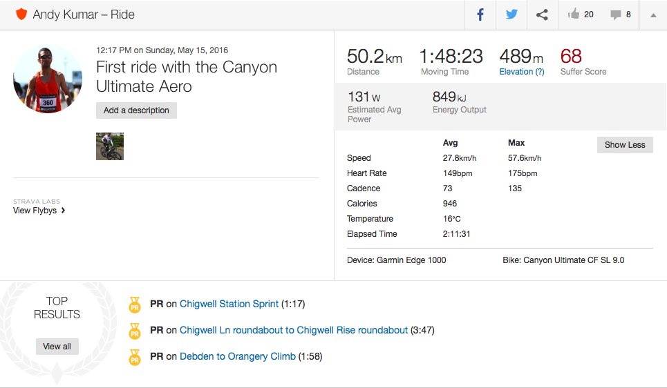 Okay, so I was in the market for a set of deep rim carbon clinchers. I am doing the London Duathlon in September again, and wanted some solid wheels which could help me smash out some PBs on the bike. After the usual research, the wheel-set that really stood out were the Mavic Cosmic Pro Carbone Exalhith. These retail for £1050 on Wiggle, after 12% platinum discount. I then saw the Ultimate CF SL 9.0 Aero, which had these wheels, as well as a full Ultegra groupset, Fizik Antares E5 saddle and Canyon V13 seat-post, all packaged with a CF Ultimate frame-set. The bike also comes (almost!) fully assembled with a bunch of Canyon goodies/accessories, so it made more sense to get a ready-made bike, whist forking out a little more, than to get the wheel-set alone or build my own bike.