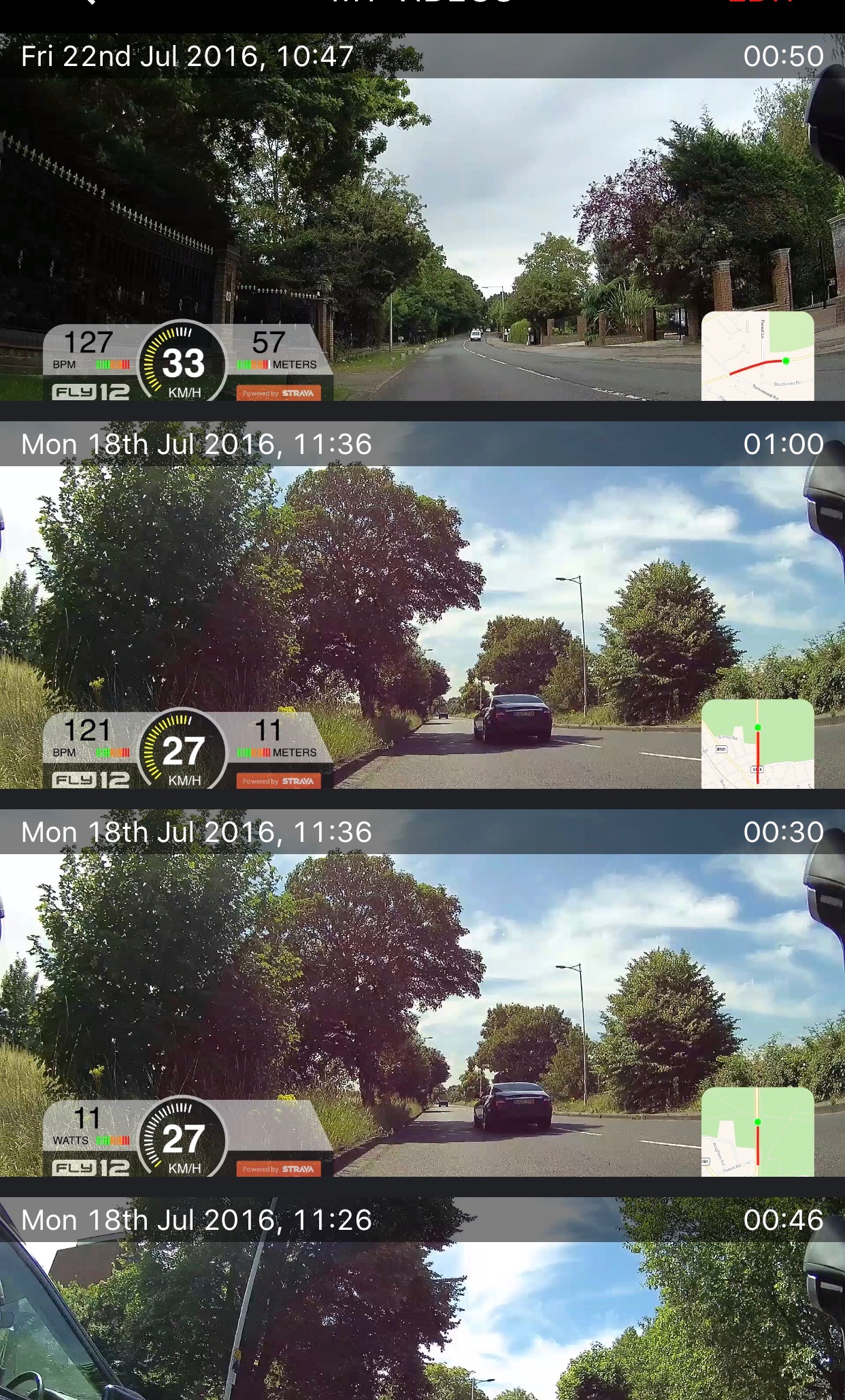 I was really looking forward to using the app to quickly view and edit my footage. Unfortunately, I was left somewhat disappointed. When you open the app and click the view footage button, the Fly12 (if within range) will automatically turn on. Great! However, connecting does take some time, as you must disconnect from your wifi network, and connect to the Fly12’s wifi network (which would already be connected to your wifi network). So basically, you have to connect to your normal wifi network ‘through’ the Fly12. Footage also takes a long time to download if you want to overlap your Strava metrics. There are also some connection dropouts at times, which can make this a frustrating affair.