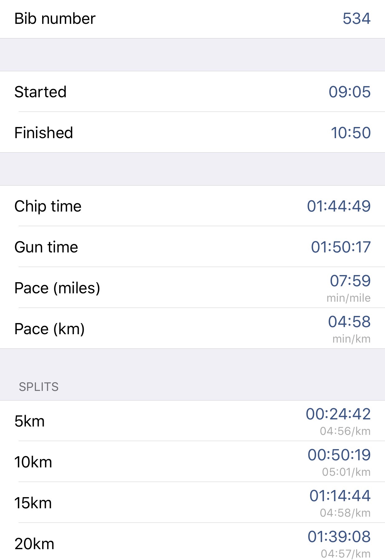 I had to slightly increase my pace after 10 miles (for just under 2 miles) as I could see that the mile markers were not matching up with my Garmin GPS data. During the final stretch running up Kensington Road to the finish was an amazing experience. I crossed the finish line with a chip time of 1:44:49. A few runners came up to me after crossing the finish line, happy to have run the course in under 1:45, which was a great feeling.