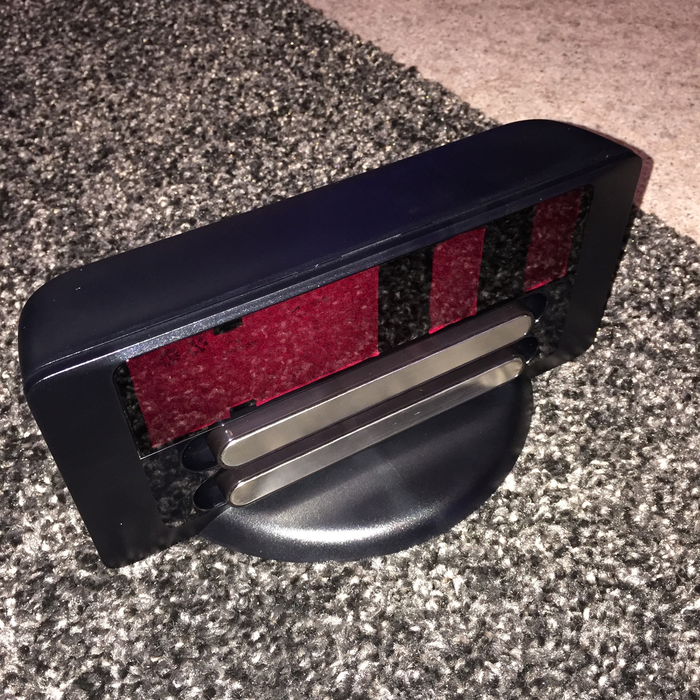 The charging base and main unit connect together by magnetic metal strips, which have a large surface area for easy docking.