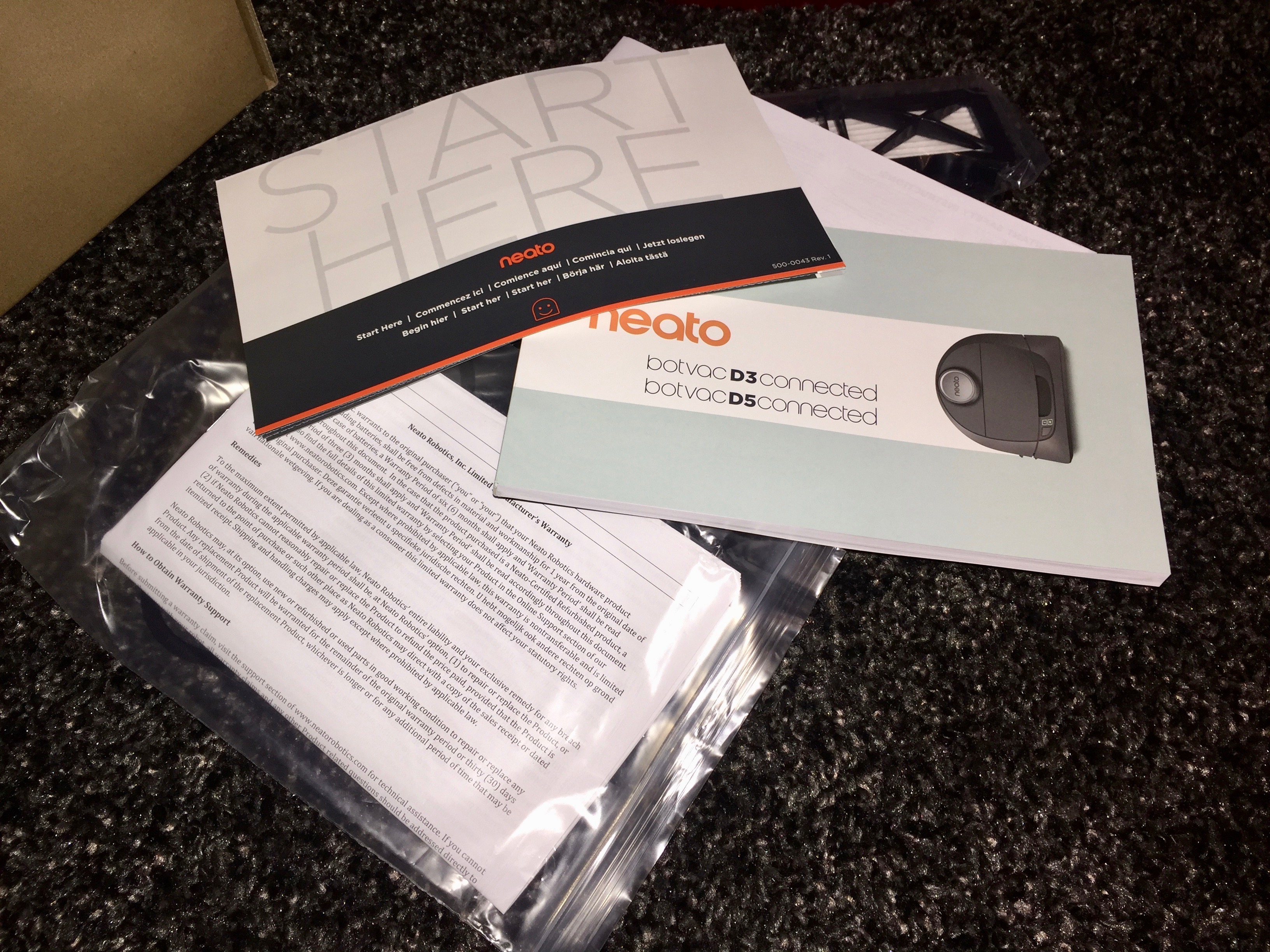 The neato botvac D5 ships in a very compact box with a handle on top. It is well packaged and easy to unbox. Included inside is the botvac itself, docking station, power cable, spare filter and belt, USB sync cable, instructions/quick-start guide and warranty information. The unit itself is very well designed. It is made from mostly plastic, but is very sturdy and solid. The plain design appears a little dated, being made from black plastic. Personally, I don’t mind this almost retro look. Featuring a D-desigm, it measures