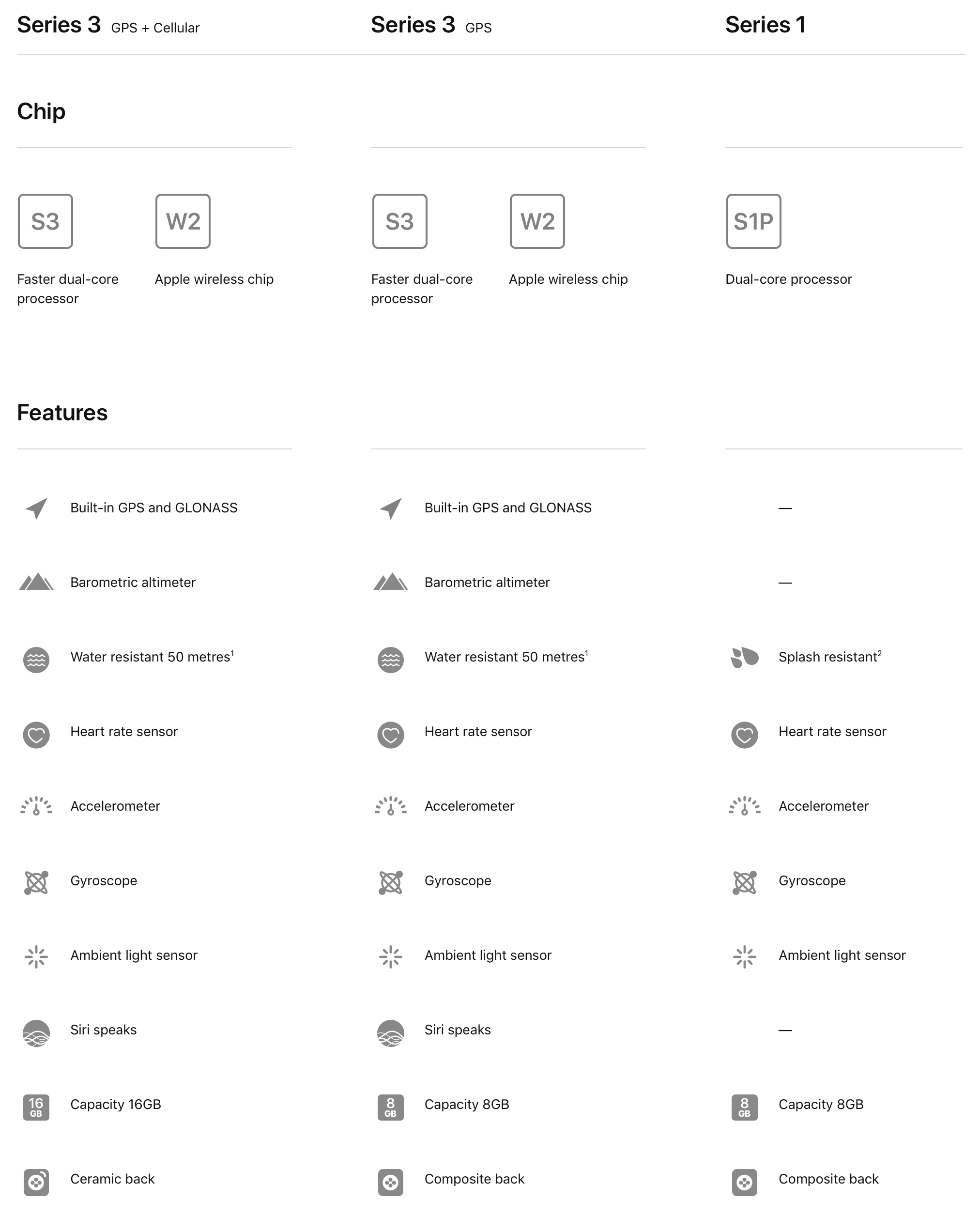 So once up and running, I had a quick play and speeds seemed to actually be comparable with my original Apple Watch. However, everything was definitely a lot smoother. Opening apps is where the series 3 really excelled. From a purely aesthetic perspective, both watts look identical, and improvements are definitely under the hood. The biggest incentives for me were the speed bump, built-in GPS and water resistance. Here is a complete breakdown of the main differences.