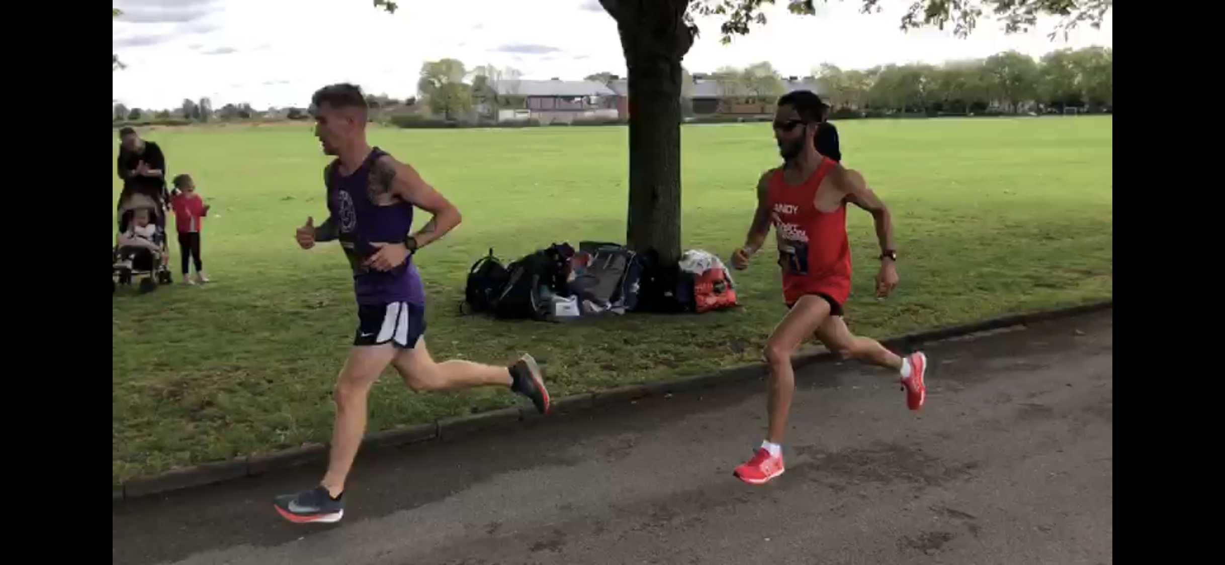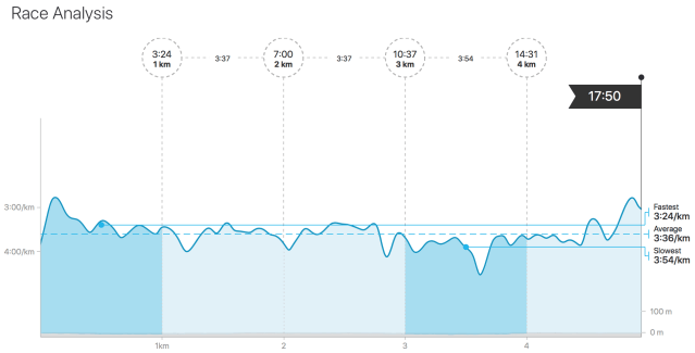 I arrived in Barking park ahead of time and engaged in a warm-up consisting of an 800m run and various stretches, with a few strides. I saw some friendly faces at the ELR gazebo and we then made our way to the start-line. It was a very congested start, and I lost a few seconds as I crossed the start line. I had to go to the side and speed off a little to get ahead. I managed to get into a clearer zone around 200-300m in, and checked my watch for the pace. I was on for the first kilometre in 3:16 which was way too fast! Although I felt good, this was clearly not a sustainable pace. I slowed down ever so slightly, and pushed on. By this point I saw runners like Mark Boulton overtake me, and I knew that was no bad thing, as these were clearly sub-17 guys. I then saw Russell Price creep up on me. I finished the first kilometre in 3:24. My mouth got quite dry, but I felt in control after this. I tried to hold on to Russell, who was now a few yards in front. The second kilometre was done in 3:37, and then the third in 3:37- still on target for my sub-18 goal.