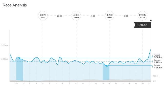 Kilometre 1: I felt absolutely great! The legs were springy, and the pace felt a lot slower than it was. I saw my pace was ~3:48/km which was quite a bit faster than the sub 1:30 goal pace I had in mind. Even though I felt strong, I obviously didn’t want to blow my engine later, so dropped the pace down.
